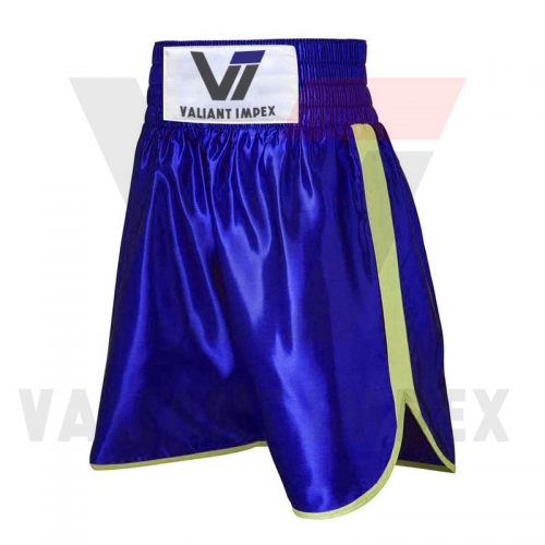 Full 4" waistband with modified flexible ensures a snug fit around the cup. Wider leg opening, high leg slits. Made of high quality satin. 24" length from waist. We are providing best quality boxing equipments with customized logo design printing and embroidery. Available almost in all colors. Our main focus over big competition, federation and club matches.