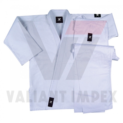 Made of 100% cotton light weight single weave rice grain fabric. Reinforced back,shoulders,chest and armpits, Added taping around collar and half of the lapel. Elasticized waist pants with drawstring Includes 1-1/2 inch white rank belt with 8 rows stitching.